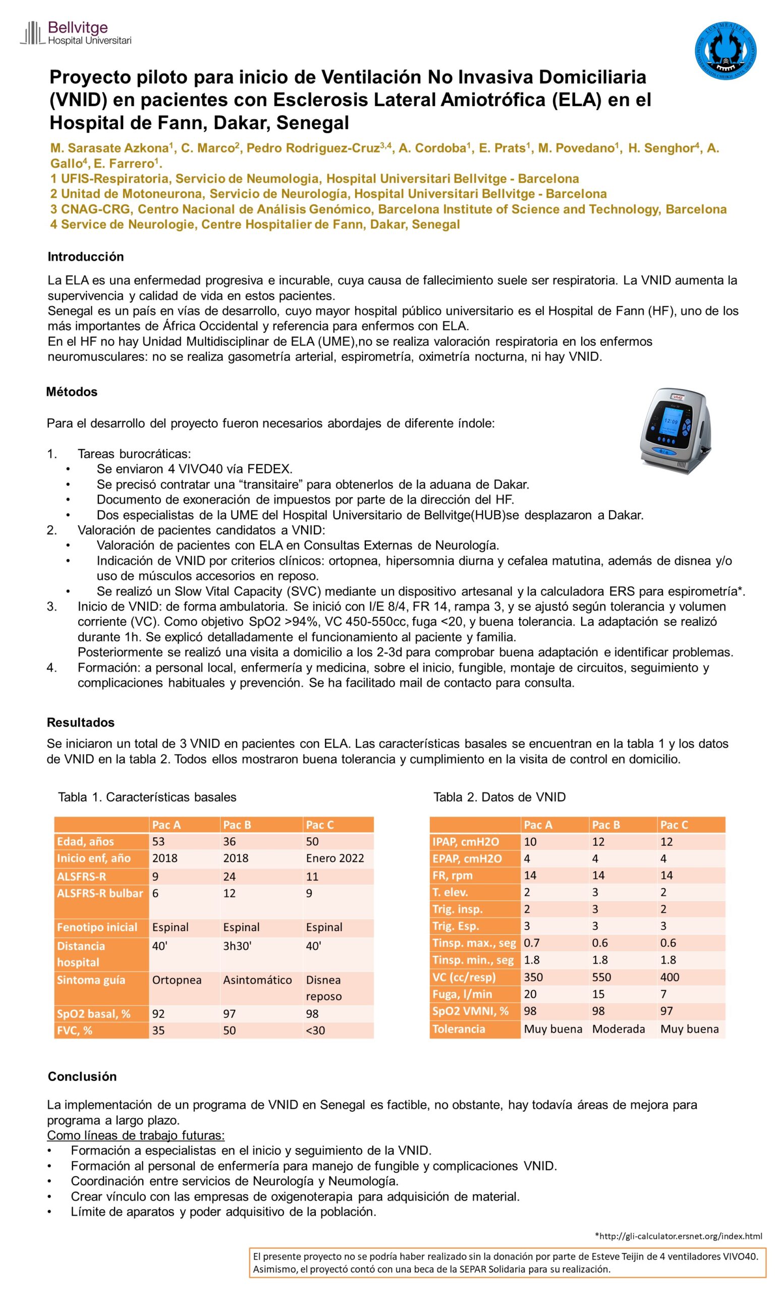 Liderado por Dra Carla Marco, neuróloga, y el Dr Mikel Sarasate, neumólogo (ambos del Hospital Universitario de Bellvitge), el proyecto ha incluido el desplazamiento a Dakar (Senegal), donde durante dos meses, se ha realizado una estancia formativa y se ha desarrollado el proyecto piloto de ventilación para pacientes con enfermedad de motoneurona.