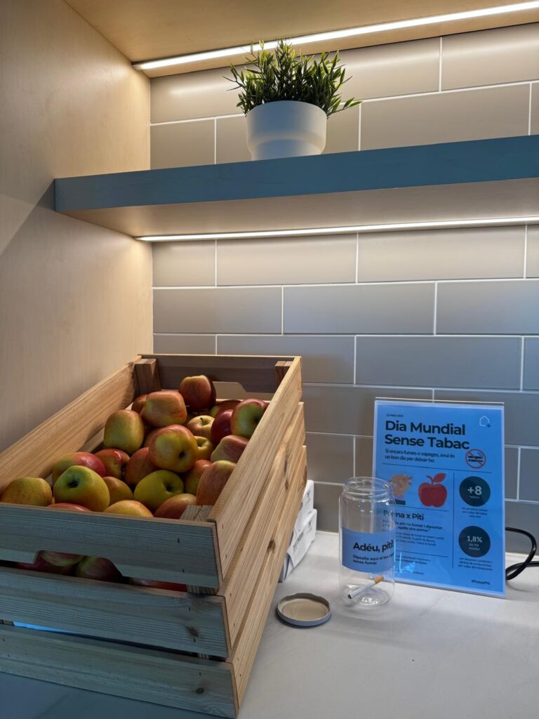 Desde nuestro compromiso con el bienestar de las personas, también dirigimos una acción de sensibilización interna entre nuestras plantillas. Bajo el nombre Manzana x Piti, propusimos un intercambio simbólico: dejar un cigarrillo a cambio de una pieza de fruta. La campaña se llevó a cabo en las delegaciones donde se ha detectado mayor número de fumadores y se complementó con mensajes motivacionales a través de los canales internos de comunicación.